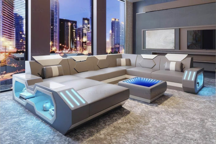 - Unique geometric design on the sides of this large corner sofa, and feature with two storage spaces.