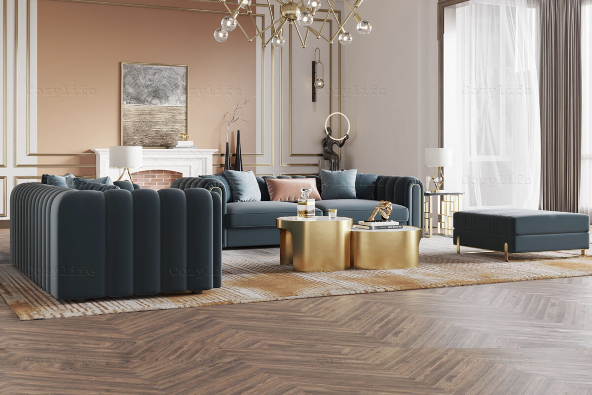 - Built on a solid wood structure, sofa arm with gold metal decoration. And with solid stainless steel base large square ottoman.